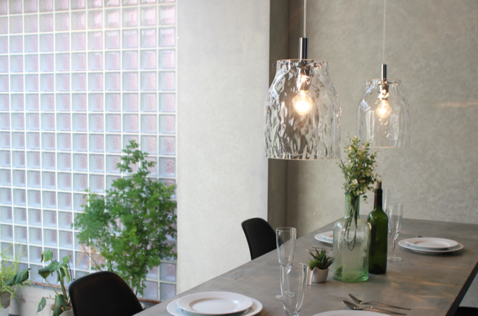 ガラスシェードのペンダントライト。波打ったガラスで幻想的な光を楽しめます。